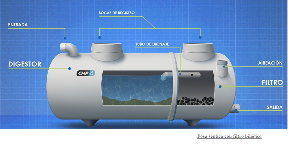 El objetivo de una fosa séptica es el de tratar las aguas residuales para así poder reutilizarlas, ahorrando costes. La fosa séptica, tal y como muestra el gráfico, basa su funcionamiento en una doble decantación.